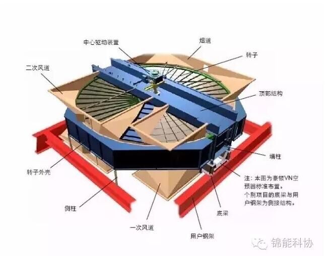 外壳起到外部密封和气体转移的效用,而中心转子为起热交换器。中心转子上,下侧的相应位置分别分成烟气流通区,空气流通区和烟气流通区。密封区域,外壳在这些区域的一定范围内形成相应的筒仓主体,即一次空气筒仓,二次空气筒仓和热空气储藏室。一次空气箱和二次空气箱形成冷空气侧,而热空气箱形成热空气侧。空气仓形成热风侧。每个筒仓体的上,下端分别由外壳和风道形成,形成各自的气流通风通道。