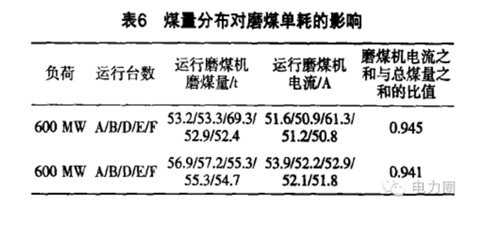 表6显示了磨煤机煤量分布对磨煤机单耗的影响。