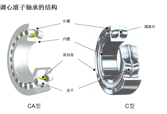 根据内圈是不是有肋和所用的保持架,它可以分成两种:c型和ca型。C型轴承的特色是内圈无肋,并使用钢制冲压保持架;ca型轴承的属性为此,内圈的两侧都有肋条,并且有一个坚实的汽车保持架。