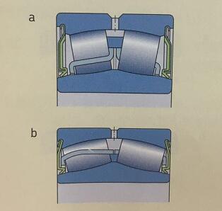 密封圈固定在外圈的凹槽中,对于较小的轴承,密封圈由凹槽夹紧(参见上文)。对于较大的轴承,32024X/DF偏低,并且密封环通过固定环固定在凹槽中(参见上图b)。密封环的密封唇与滚道的两侧触及内圈的内径可以为轴承提供有效性的密封。